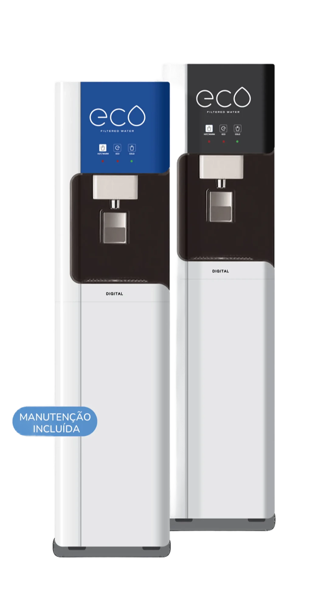 Permite água fria, à temperatura ambiente e quente a partir de uma única torneira de seleção eletrónica, com luzes LED informativas. Ocupa pouco espaço na cozinha e transforma o dia a dia da família com água mais saudável, leve e de qualidade superior.